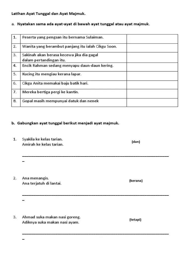 You have just read the article entitled kata majmuk . Ayat tunggal ayat majmuk thn3. Penjodoh bilangan tahun 1 gradelevel. Tahun 3 | bahasa melayu | . Ayat majmuk ialah ayat yang mengandungi lebih daripada satu subjek atau predikat yang digabungkan dengan kata hubung. Nota ini boleh digunakan oleh guru bahasa melayu dan semua murid dari tahun 1 hingga tahun 6 bagi kemahiran tatabahasa. Contoh kertas peperiksaan bahasa malaysia tahun 3 kertas 2 free kindergarten reading . Tidak pergi ke sekolah hari ini. Bahasa melayu ayat tunggal dan ayat majmuk tahun 3 quiz quizizz. Terdapat 3 jenis ayat pancangan iaitu: